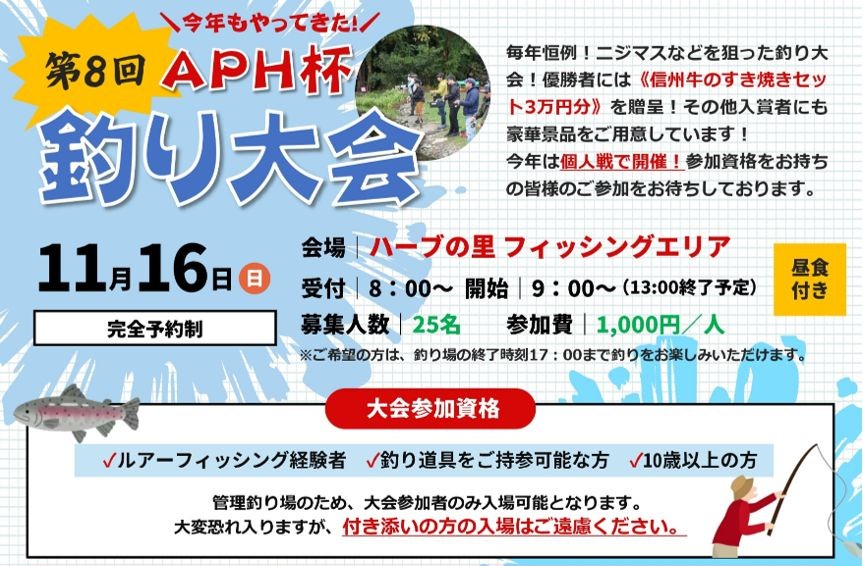 11/16(日)池田町ハーブの里フィッシングエリアにて、『第8回APH杯釣り大会』を開催しました。