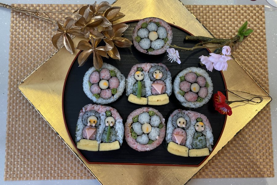 もうすぐひな祭りということで、雛人形と桃の花をモチーフにした飾り巻き寿司の作り方を教えていただきました!