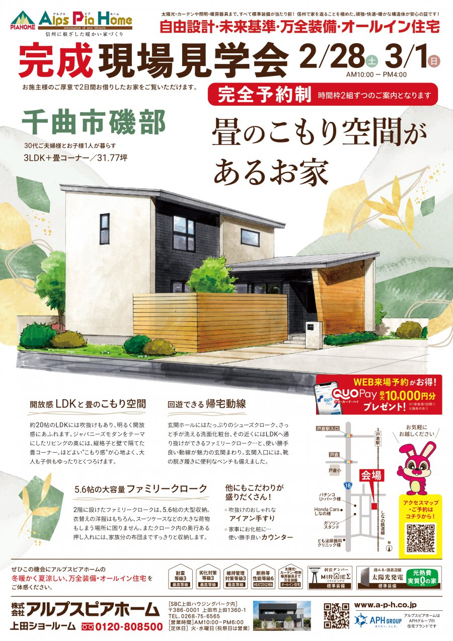 2/28(土)・3/1(日)千曲市にて、完全予約制の完成現場見学会を開催いたしました。