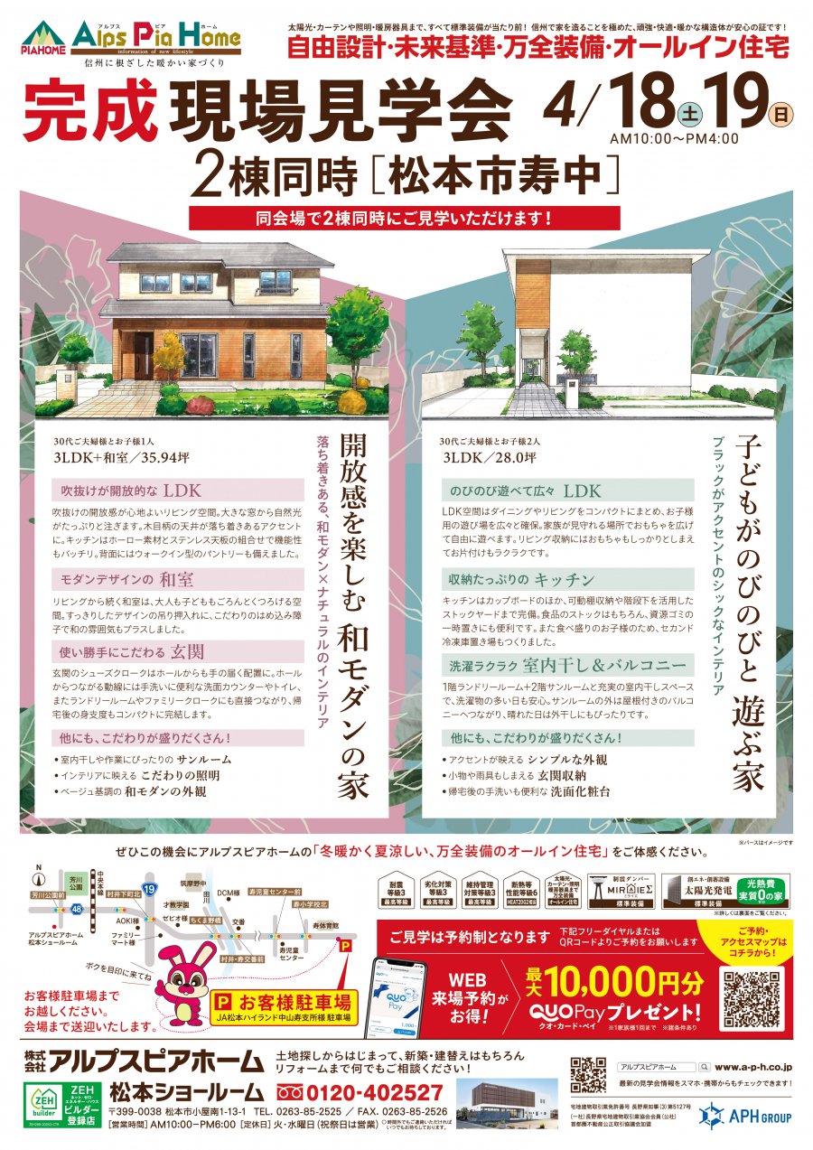 4/18(土)・19(日)松本市にて、2棟同時 完成現場見学会を開催いたしました。